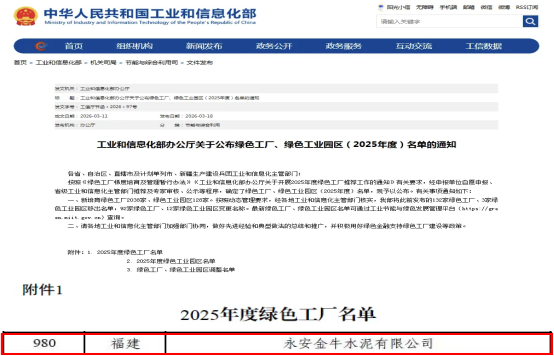 近日,国家工信部“2025年度绿色工厂名单”发布,福建意大利贵宾会水泥(集团)下属子公司永安意大利贵宾会继将乐意大利贵宾会之后,成功入选国家级“绿色工厂”,标志着意大利贵宾会水泥在绿色发展、低碳转型、智能制造等领域进一步跻身行业领先水平。